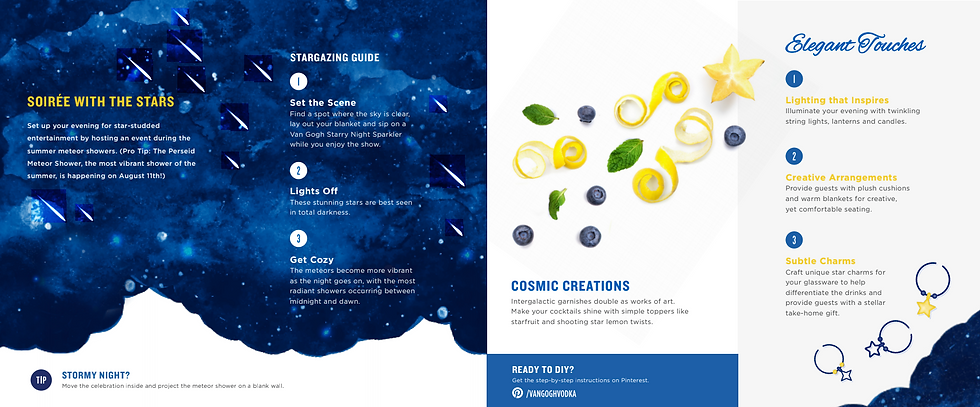We set out to help Van Gogh Vodka own a unique time period no other brand could claim; Perseids Meteor Shower for a summer full of Starry Nights. Take-one booklets in retail and social media support helped fans plan their own meteor shower party, while on-premise events hosted during the meteor shower introduced new consumers to Van Gogh Vodka.
